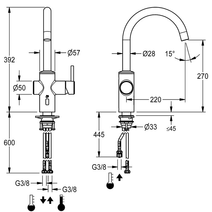 * Schwenkauslauf fest, erweiterbar auf 50°, 120° und 360°