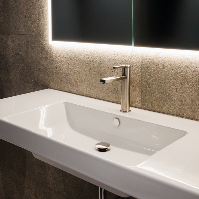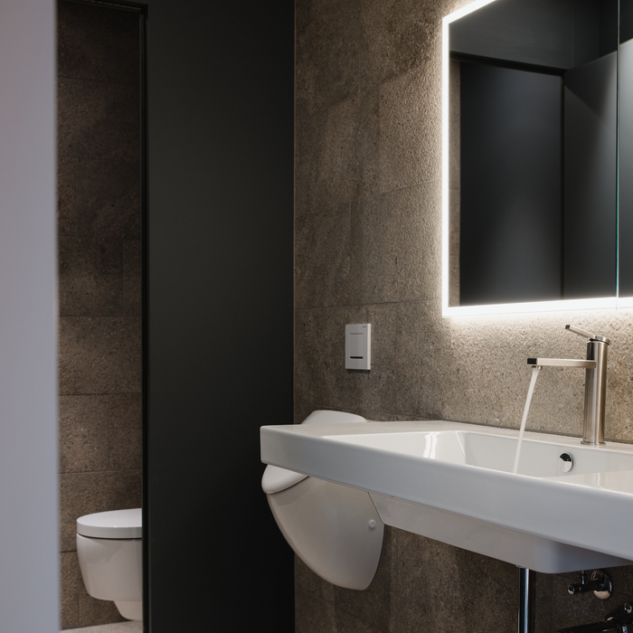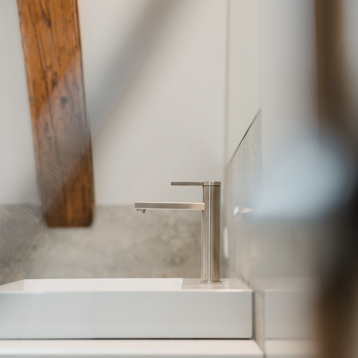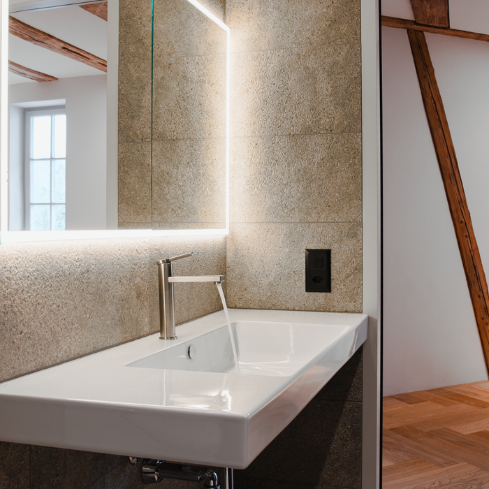 Für die Ausstattung der Bäder fiel die Wahl auf die KWC AVA E – eine Serie, die dieselben Werte verkörpert wie das gesamte Projekt: Präzision, Reduktion und Beständigkeit. Ihre reduzierte Formensprache und hochwertige Verarbeitung verbinden sich harmonisch mit der zurückhaltenden Architektur. Die Armatur fügt sich ein, ohne sich aufzudrängen und ist präsent durch Qualität, nicht durch Lautstärke.