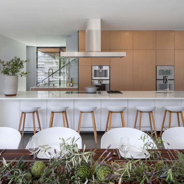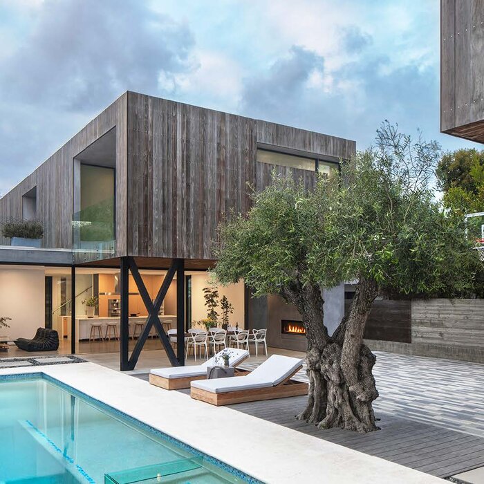 Im Inneren sorgen natürliche Materialien wie Holz, Beton und Feuer für eine warme, ruhige Atmosphäre. Nachhaltige Bauweisen, energieeffiziente Systeme und langlebige Materialien wie Kebony-Holz unterstreichen den umweltbewussten Charakter des Hauses – ein harmonisches Zusammenspiel von Design, Funktion und Achtsamkeit.