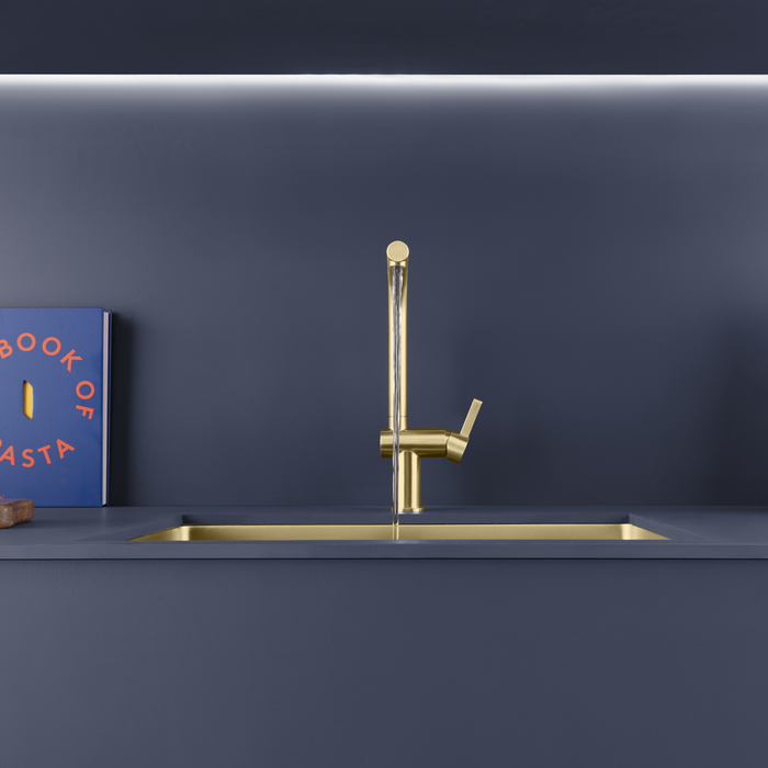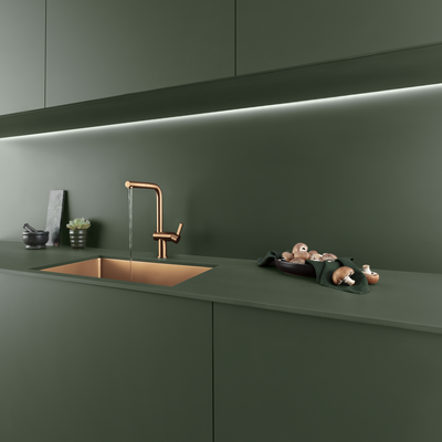 Die formschöne KWC BEVO E interpretiert klassische KWC-Designelemente. Wo sie im Einsatz ist, wird sie zum Blickfang: egal ob in Edelstahl, industrial black, brushed copper, gold oder graphite.