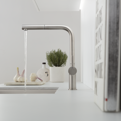 Premiumedelstahlarmatur mit hohem Anspruch an Design und Hygiene.