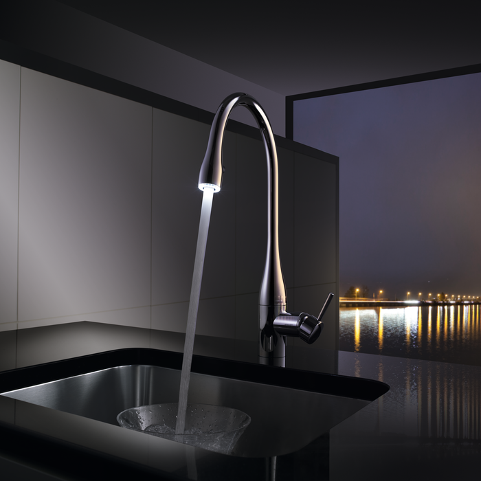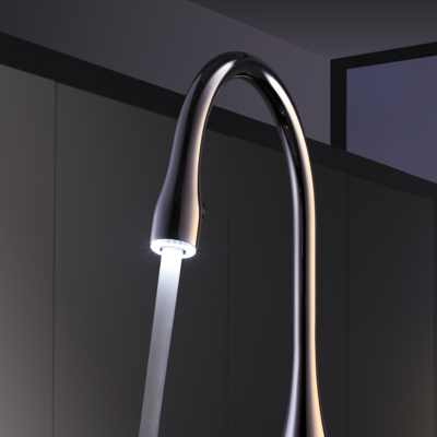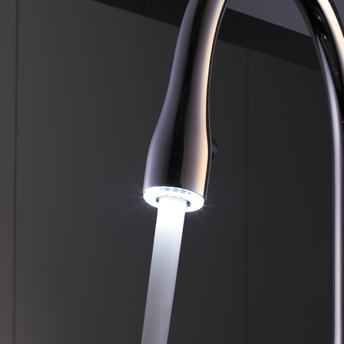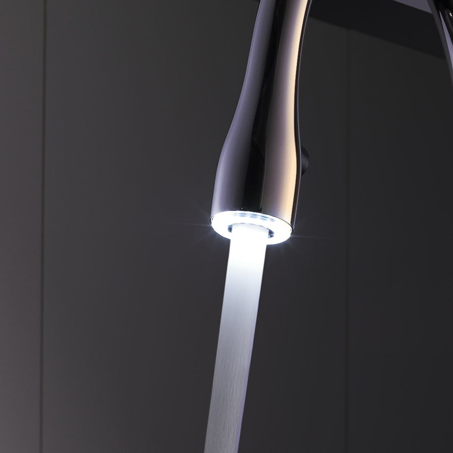 Das LED-Licht im Auszug sorgt für helle Freude bei Arbeiten. Es schafft ein spezielles Ambiente in der Küche, leuchtet aber auch kleinste Schmutzpartikel besser aus und ermöglicht die Bedienung der Armatur auch ohne Küchenlicht.