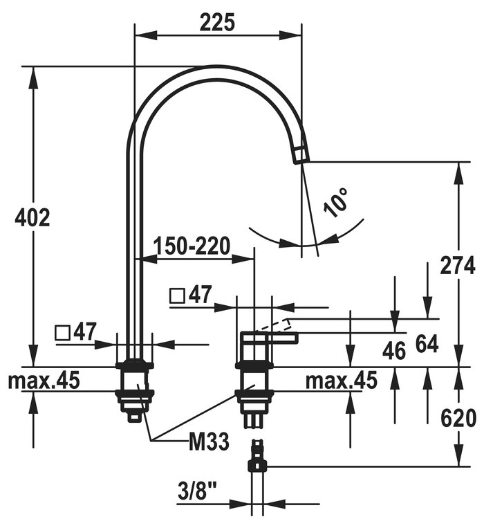 * Schwenkauslauf 150°, erweiterbar auf 360°