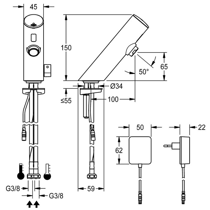 F3E-Mix-pylväshana, DN 15, pesualtaisiin, optoelektronisesti ohjattava. Liitetään lämpimään ja kylmään veteen letkuilla yhdessä integroitujen takaisinvirtauksen estimien ja sihtien kanssa. Ohjauselektroniikka, magneettiventtiili ja sensori. Täysmessinkinen, korkeakiiltoinen kromattu hanarunko. Sisältää lämpötilansäätövivun sekä säädettävän, tahattomalta kääntämiseltä suojatun lämpötilanrajoittimen. Poresuutin integroidulla virtaaman säätimellä 6,0 l/min. Aktivoi hygieniahuuhtelun 24 tuntia edellisen käytön jälkeen. Turvasammutus jatkuvassa heijastuksessa sekä tilastotietojen tallennus. Mahdollisuus parametrisointiin ja kommunikointiin valinnaisella kaksisuuntaisella kaukosäädöllä. Varustettu pistokeverkkolaitteella 100–240 V AC.