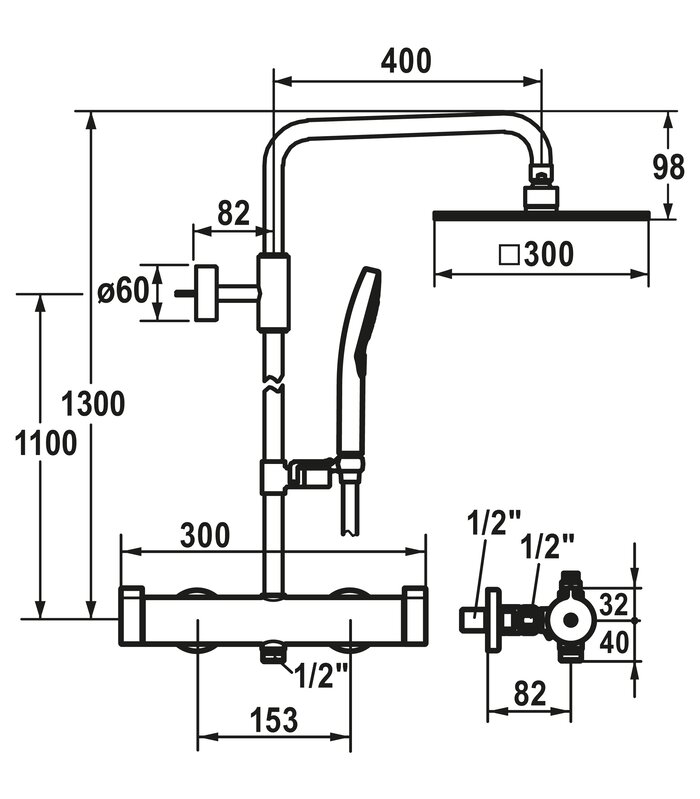 - Mitigeur thermostatique y compris raccord mural avec départ (en haut) pour glissière de douche conduisant l'eau