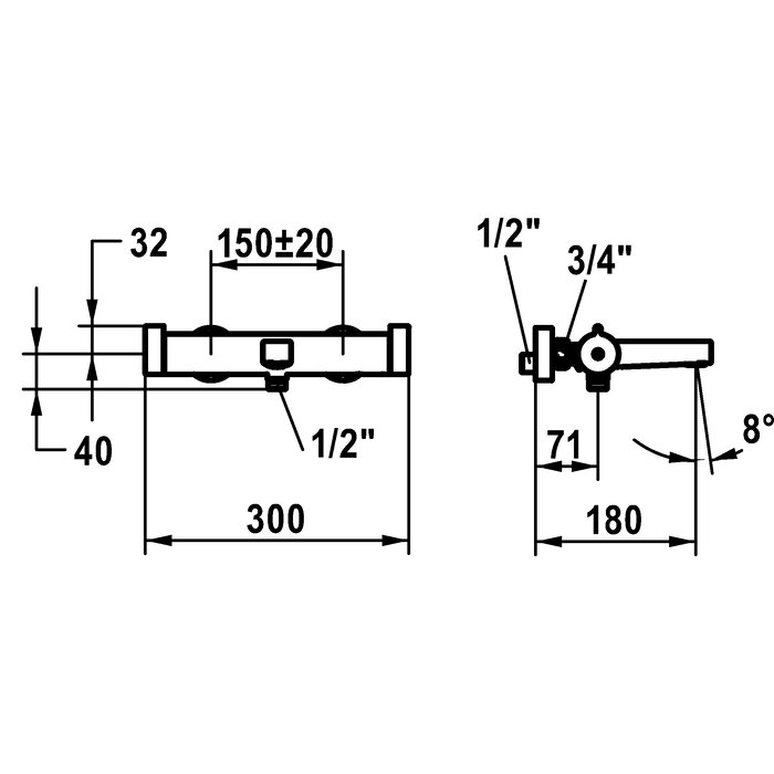 * Wandaansluitingen ½" x ¾", niet afsluitbaar excentrisch 10 mm