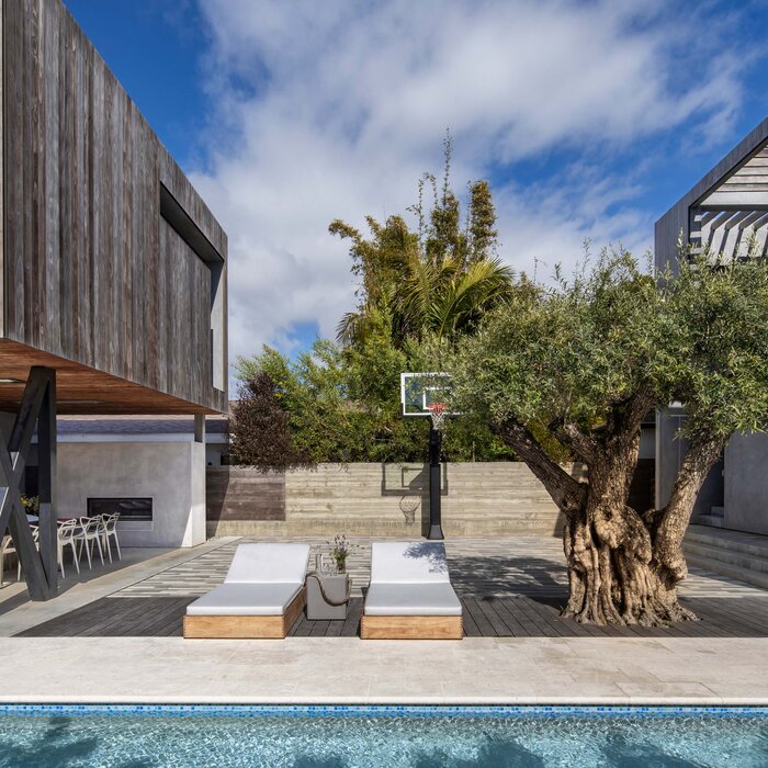 Ein geschützter Innenhof mit Koi-Teich und Olivenbäumen bildet das Herz des Hauses und verbindet Natur, Ruhe und Privatsphäre. Grosszügige Glasfronten und Schiebetüren lassen Innen- und Aussenraum nahtlos verschmelzen, während eine Dachterrasse mit Blick auf Pool und Basketballplatz Raum für Erholung und Spiel schafft.